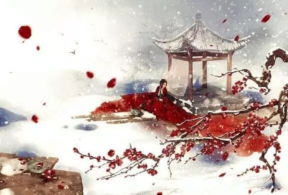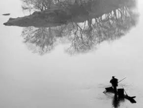 是日更定矣,余挐一小舟,拥毳衣炉火,独往湖心亭看雪。雾凇沆砀,天与云、与山、与水,上下一白。湖上影子,惟长堤一痕、湖心亭一点、与余舟一芥、舟中人两三粒而已。