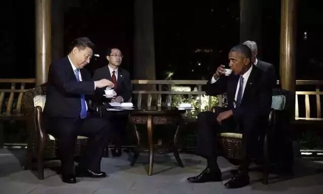 这次在杭州的G20峰会中,习近平主席和奥巴马总统一起到西湖国宾馆的涼亭处边喝茶边聊天。老茶客习近平主席这次选用盖碗喝茶,暗含天地人和之意,并选用名茶西湖龙井招待贵宾。而每一次“习奥会”都开启了中美关系新的一页。